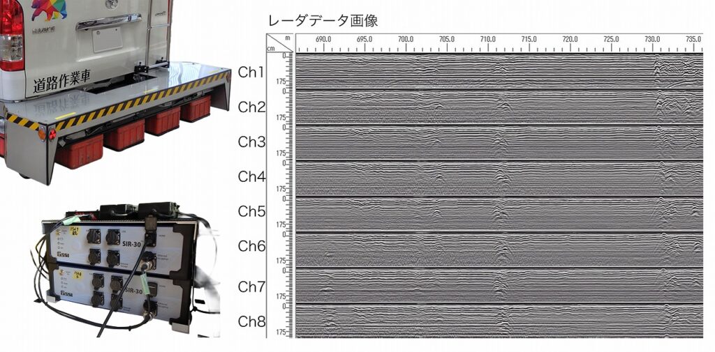 地中レーダとMMSを搭載した車両で、レーダのデータとGNSS・点群データ、360°カメラを1走行で一緒にデータが取得できる計測車です。