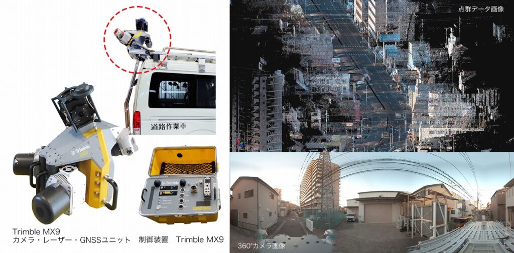 MMS(モービルマッピングシステム)は、Trimble MX9を搭載。高精度な点群データと360°全方位カメラ画像を走行するだけで取得でき、また、最先端のGNSS/IMU※装置により、高精度な位置情報を取得できます。