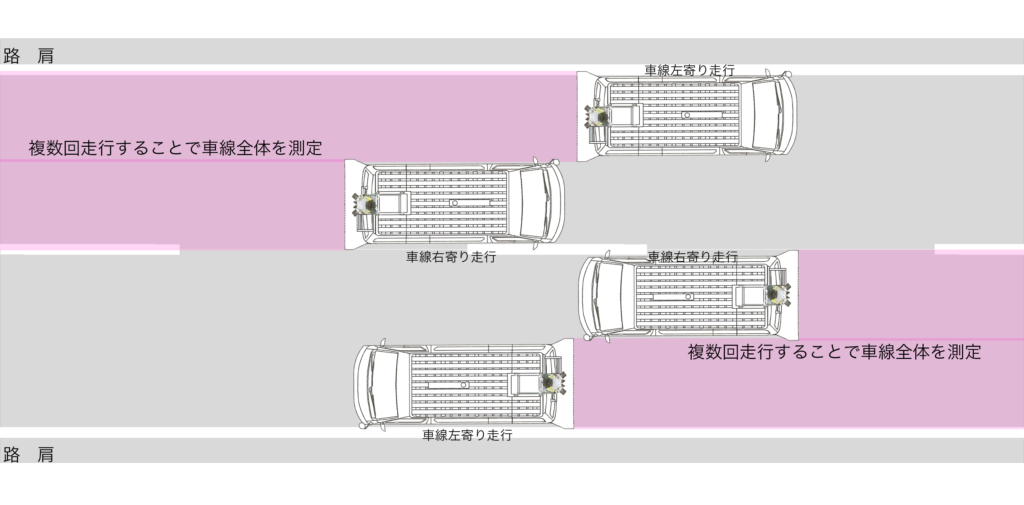 道路の測定時は、調査範囲を漏れなくカバーするために複数回走行を行ないます。