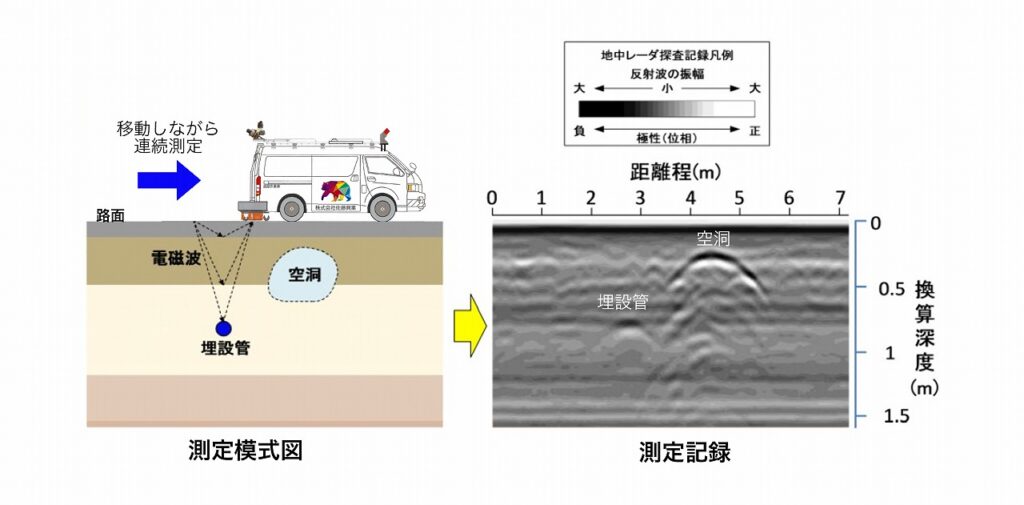 地中レーダは道路上から道路の下に向け電磁波を照射し、照射した反射波から空洞や埋設管の位置などを推定する技術です。道路などを非破壊で広範囲の地下の状況を効率よく推定することができます。